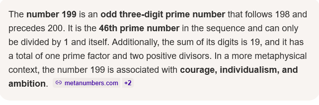 When combined, these digits suggest that 199 represents God’s perfect and complete work in the lives of believers. It serves as a reminder of God’s faithfulness and the fulfillment of His promises. 2 2 Sources